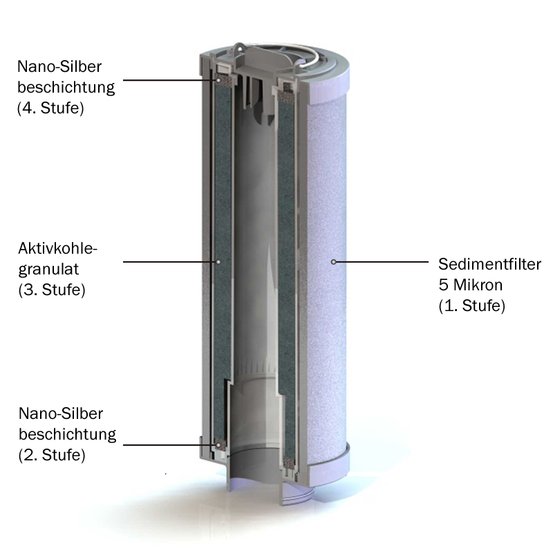 Der patentierte 4in1 Wasserfilter verfügt über zwei neuartige Nano-Silber Filtrationsstufen, so dass Bakterien bereits bei der Vorfilterung aus dem Leitungswasser entfernt werden. Der 4in1 Wasserfilter hat einen praktischen Griff und gewährleistet dadurch einen hygienischen und kinderleichten Filterwechsel - einfach den Verschluss oben öffnen, Membrane und Filter einsetzen - fertig!